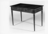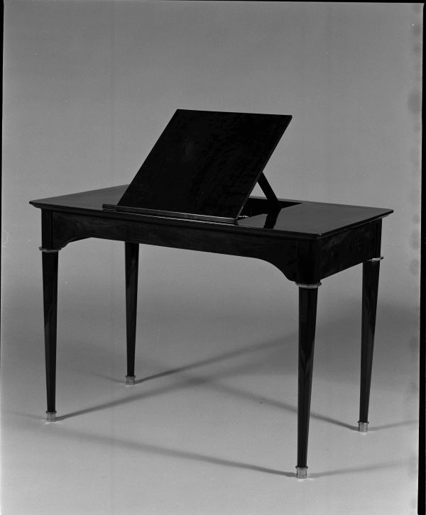 4 Pieds à 6 pans avec sabot et bagues de cuivre, devanture évidée sur la façade, dessus à frise aux angles arrondis, panneau à secret dans le milieu, pour former pupitre liseuse avec crémaillère.