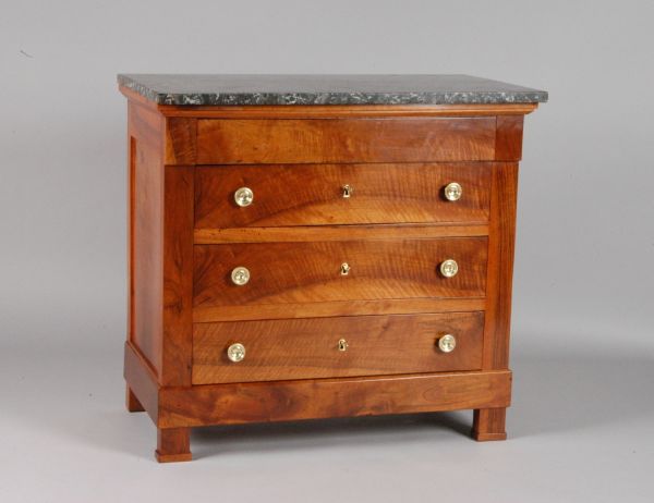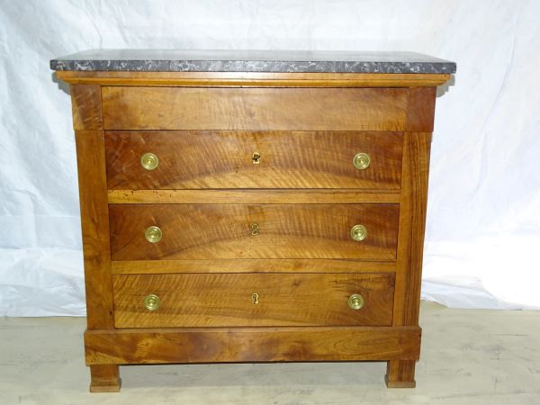 4 pieds carrés. 3 tiroirs à clé. Boutons cuvette molletés. 1 tiroir uni dans la ceinture. Marbre St. Anne rectangulaire à angles vifs.