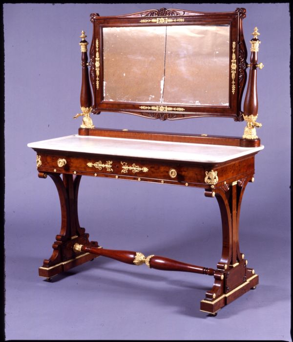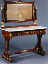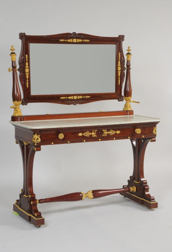 La ceinture à gorge et à angles arrondis forme tiroire et est parsemée de motifs de palmettes, rosaces et rinceaux de bronze doré. Le plateau est en marbre blanc. Le miroir pivotant et rectangulaire est inséré dans un cadre à fond creux moluré avec appliques en bronze doré aux axes. Les quatre côtés du cadre, à fronton découpé en double doucine, sont sculptés de palmettes et rinceaux et sont supportés par des balustres, dont les socles et les têtes sont garnis de culots de feuilles en bronze doré. Ils sont munis d'un dispositif pivotant pour la lumière.