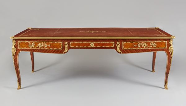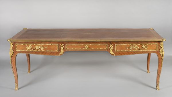 Bureau en bois de rose et violette avec quatre pieds galbés avec sabot, chute de culots, bronze ciselé. Trois tiroirs à clef, trois faux tiroirs avec poignées ciselées. Dessus rectangulaire bordé d'une moulure cuivre et gainé à frise drap vert, coins arrondis.