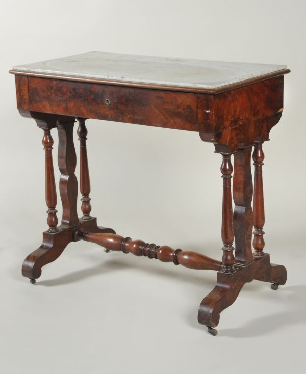 2 patins chantournés en doucine à rouleau extrême sur roulettes. Sur chaque patin 2 montants tournés en balustre de chaque côté d'un montant carré chantourné double poire; sous une traverse chantournée en ogives. Traverse d'entrejambe tournée poires. Ceinture unie à 1 tiroir entrée circulaire. Dessus marbre blanc évidé en ovale et encastré dans une bordure arrondie.