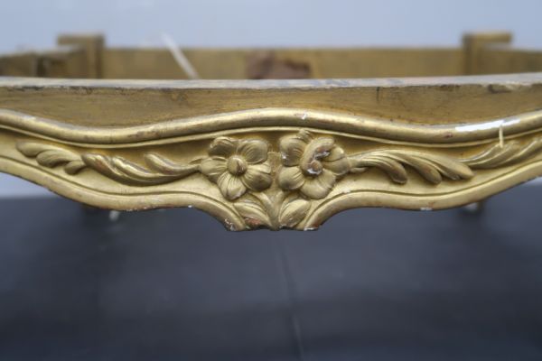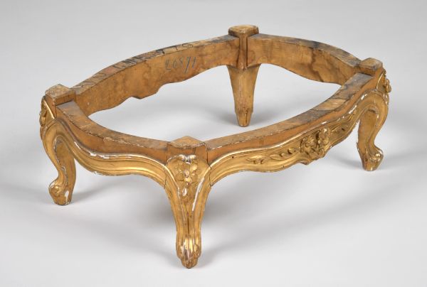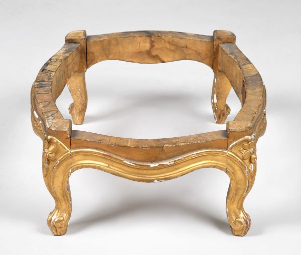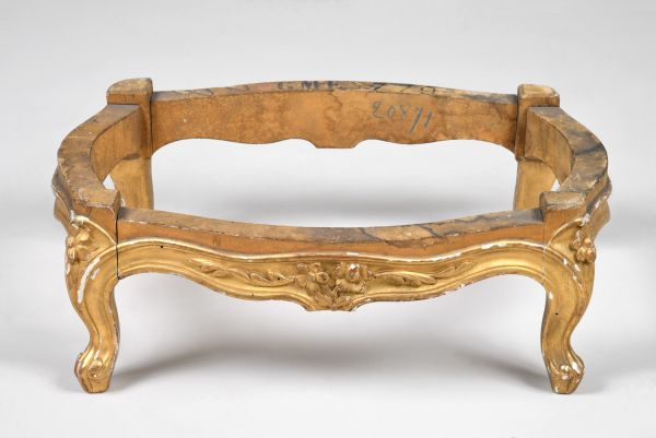 Quatre pieds galbés, moulurés, tête à fleurette. Ceinture chantournée, moulurée, toutes faces doucine, les 2 longues à double fleurettes flanquée de 2 palmes.