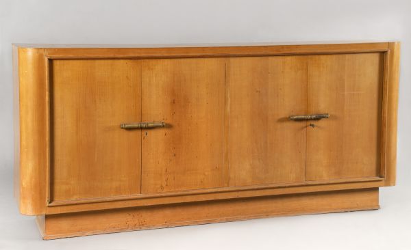 Large buffet de salle à manger reposant sur un socle rectangulaire en retrait, le dessus plein, les angles antérieurs arrondis. Quatre vantaux pleins encadrés par une moulure saillante, ouvrant par quatre poignées de bronze jointes deux à deux.