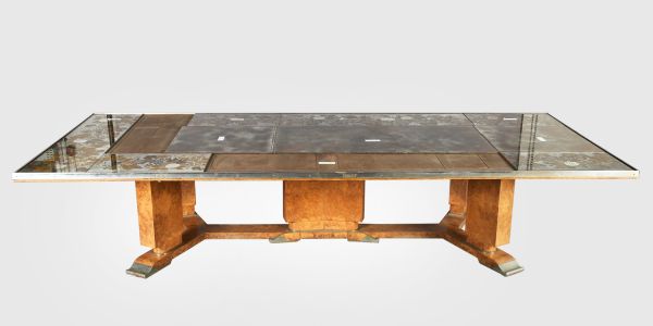 Base formée d'une traverse en double Y à garniture de métal argenté, portant cinq piètements rectangulaires avec base en retrait. Grand plateau rectangulaire uni avec glace étamée en morceaux à joints vifs, décorés de feuillages.
