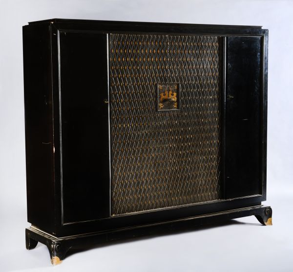 Pieds antérieurs découpés à sabot cuivre, pieds postérieurs carrés, socle plat rectangulaire. Grand coffre rectangulaire avec deux panneaux unis de chaque coté à clef ; au centre deux panneaux formés de losanges avec incrustations. Trois tablettes sur taquet à l'intérieur ; motif central incrusté cuivre au milieu. Dessus plein à petit retrait.