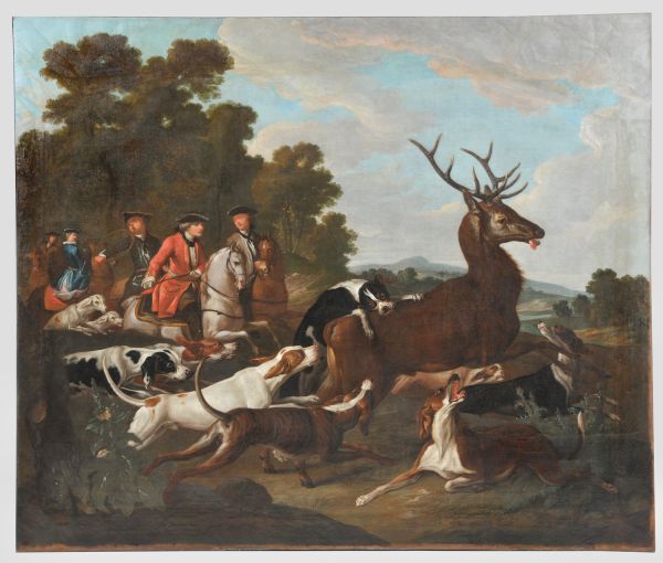 Dans un décor de verdure, un cerf est suivi de chiens et de cavaliers dont un sonne du cor.