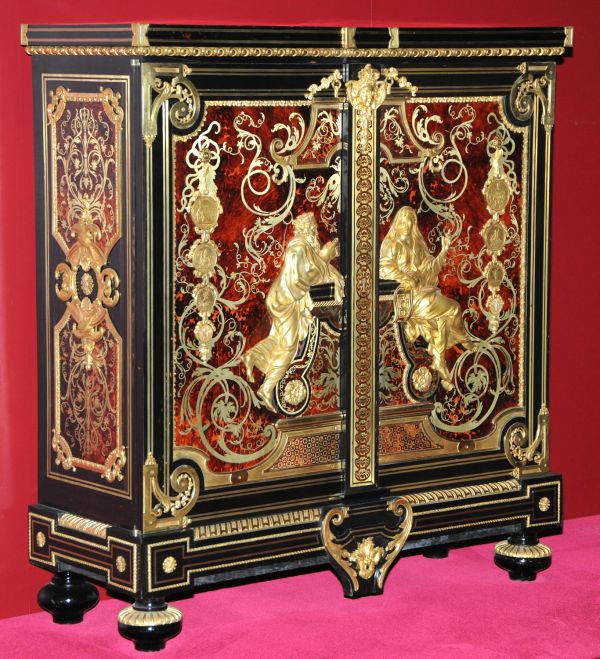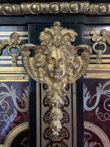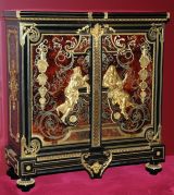 Armoire basse en bâti de bois de chêne et placage de bois d'ébène, marqueterie de métal et bronzes dorés.