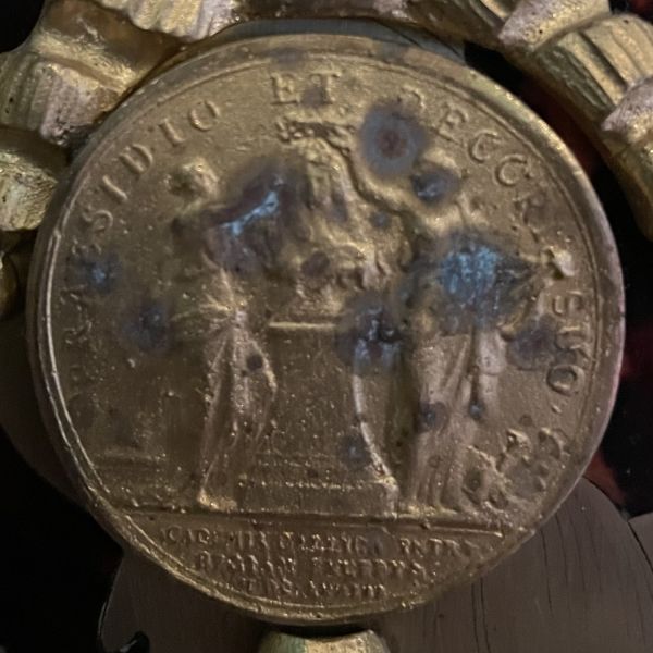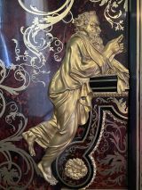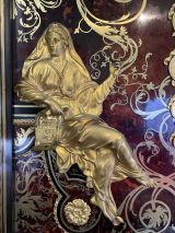 En applique centrale, deux personnages drapés représentant Socrate et Aspasie. Sur les faces latérales, entrelac central d'acanthes.