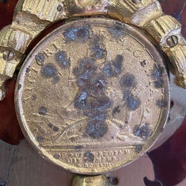 Large dessus plein, rectiligne, saillant, et à sa base une frise moulurée en oves en bronze. Champs à filets de bronze.