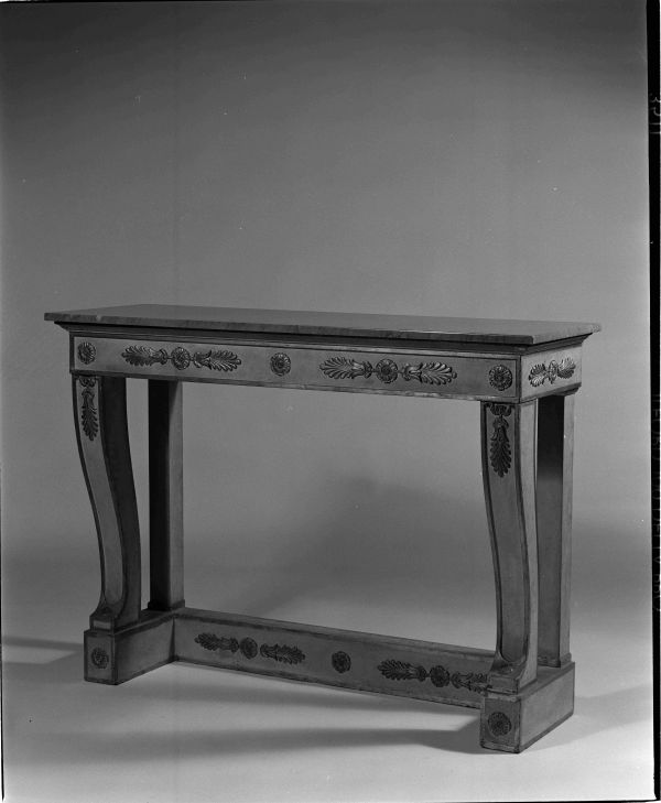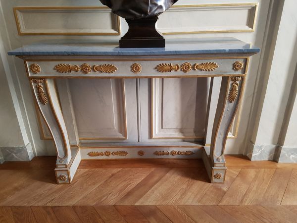 Socle en 3 grosses traverses rectilignes une de fond et 2 de côtés ( arêtes peintes or ) rosaces à palmettes sculptées en appliques sur les faces intérieures, 1 seule rosace en façade.2 montants antérieurs en gaine chantournés en doucine face fond creux arrêté en demi-cercle à la base ( arêtes peintes or ) rosace sous le fond creux et chute au sommet faite d'un culot feuilles à très grosse palmette.Ceinture rectangulaire à fond creux en façade; mêmes rosaces et palmettes que sur le socle ( arêtes peintes or ) 2 montants postérieurs carrés à moulure or haute et basse.Corniche moulurée.Dessus marbre granit noir.