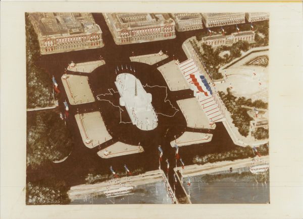 Dessin issu d'un ensemble de 6 relatifs au projet de fête civique place de la Concorde par Jean-Charles Moreux. Représentation en couleurs d'une vue aérienne de la place de la Madeleine avec contours de la France se dessinant au sol et tribune au pavoisement tricolore.