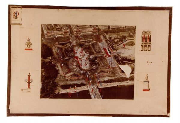 Dessin d'un ensemble de 10 relatifs à un projet de funérailles nationales au Panthéon par Jean-Charles Moreux. Représentation en couleurs d'une vue aérienne de la place de la Concorde vers la Madeleine avec des éléments de décoration des lampadaires, des statues et des bâtiments.