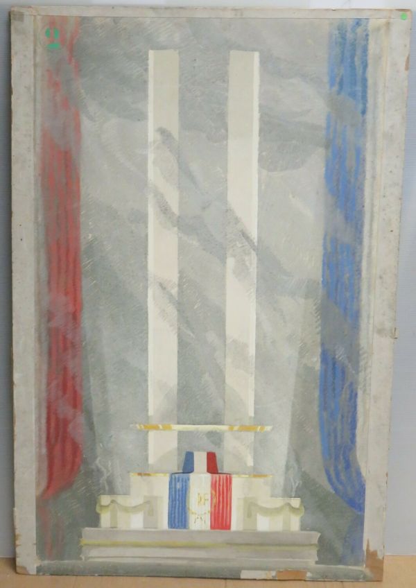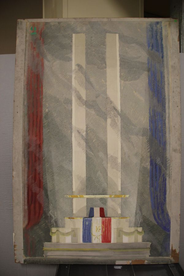 Dessin d'un ensemble de 9 relatifs à un projet de funérailles nationales au Panthéon, par Étienne Kohlmann, en collaboration avec l'architecte Émile Aillaud (1902-1988) et J.-F. Meunier, dans le cadre d'un concours organisé par le ministère des Beaux-Arts en 1933 (date à vérifier).