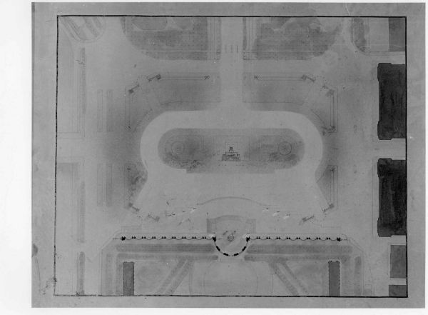 Dessin monté sur châssis d'un ensemble de 7 relatifs à un projet de fête civique place de la Concorde par C.F. Duval et Auguste François. Représentation de la vue aérienne de la place de la Concorde.