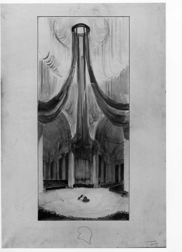 Dessin d'un ensemble de 10 (9 répertoriés) relatifs à un projet de funérailles nationales au Panthéon par J. Warnery. Représentation de la vue du chœur avec le catafalque et un dais tombant de couleur rouge.