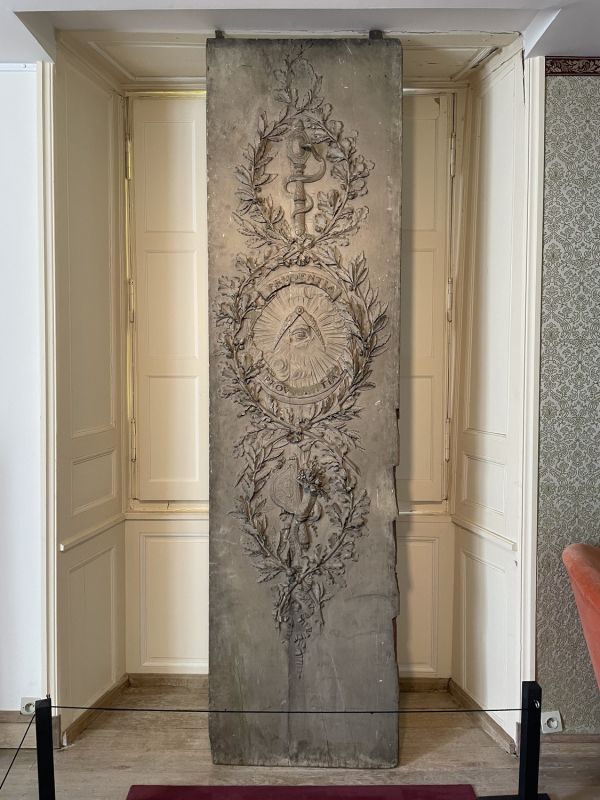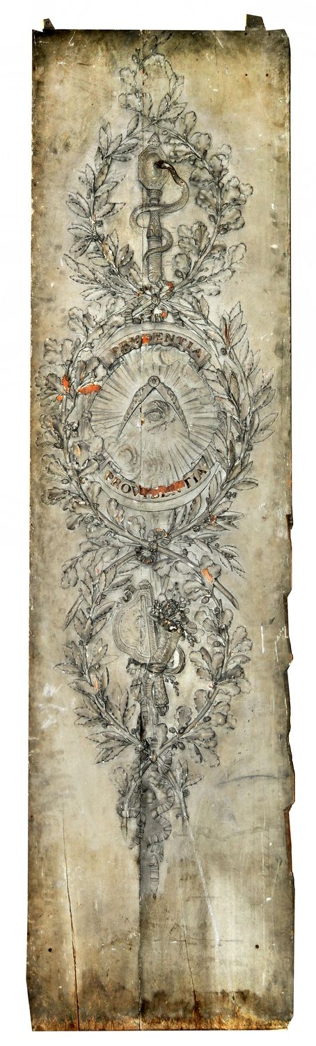 Au milieu de feuillage de chêne et de laurier entrelacés pour former trois réserves superposées, sont disposés différents ornements : dans la réserve centrale un oeil devant une gloire est placé sous une ouverture de compas ; dans la réserve supérieure un serpent s'enroule autour d'un miroir ; dans la réserve inférieure une corne d'abondance accompagne un gouvernail. un ruban noué suit le contour de la réserve centrale, il porte les mots "Prudentia et Providentia".