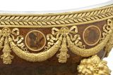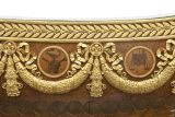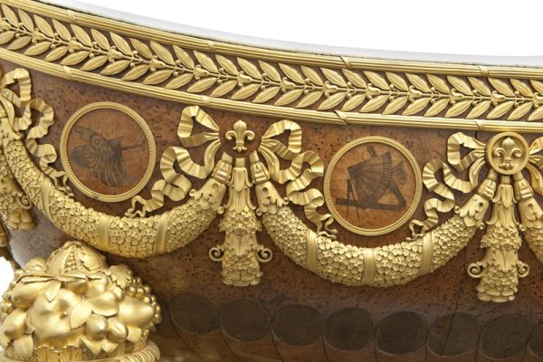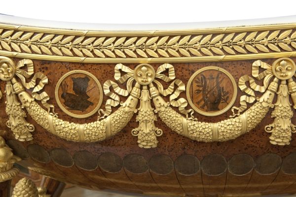 Nacelle entourée de guirlandes de lauriers à baguettes cannelées, fleurs de lys, rubans guirlandes de fleurs en bronze ciselé, et doré. À une extrémité, une Renommée en bronze ciselé et doré tenant une corne d'abondance débordante de fruits et de légumes fait corps avec la nacelle ovale. L'autre extrémité est terminée en volute et couronne avec fleurs de lys, rinceaux, médaillon en bronze ciselé et doré.