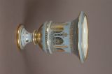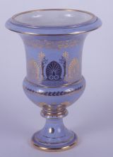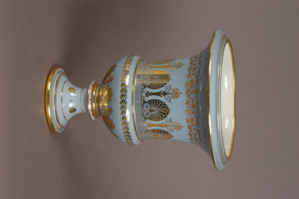 Porcelaine dure de Sèvres. Forme Médicis, fond coloré bleu clair, ornements (grecque, culots, palmettes, lierre) et filets or.