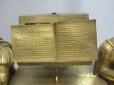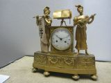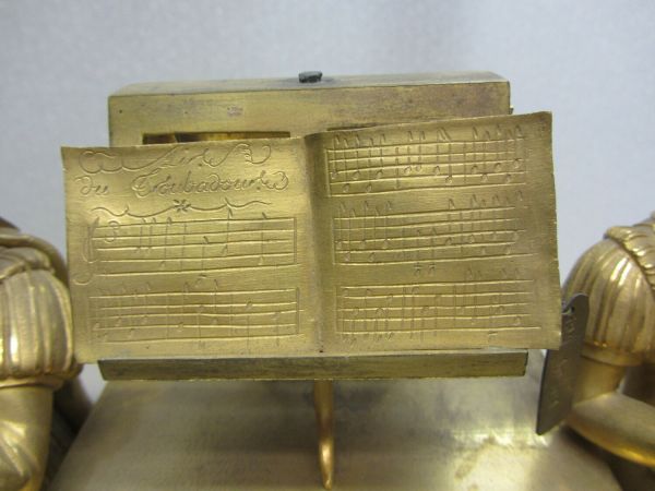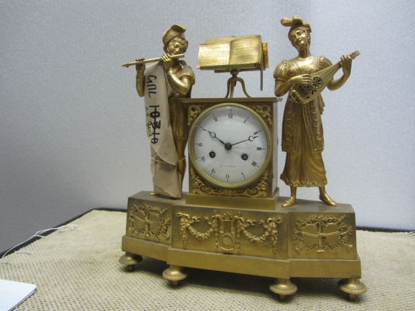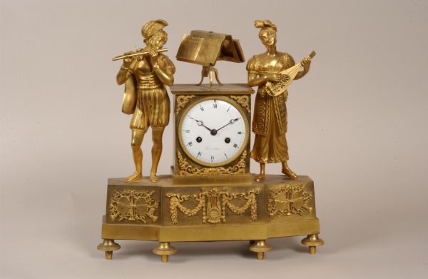 Socle barlong à décrochement reposant sur 4 pieds courts, tournés, moletés ornés sur la façade d'appliques offrant une lyre encadrée de chutes et de guirlandes au centre et de trophées musicaux aux extrémités. Sur le socle, au centre est posée une stèle enfermant le cadran, surmontée d'un pupitre à musique. Encadrant la stèle 2 personnages dont un homme à gauche jouant de la flûte et une femme à droite jouant de la guitare.