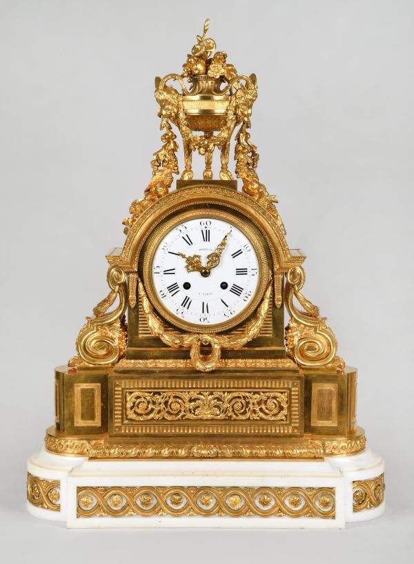 Sur un contre socle de marbre blanc oblong à angles arrondis et frise de bronze doré applique se pose une pendule de forme borne, encadrée de 2 consoles - Sur base ornée d'une riche frise de rinceaux cadran encadré d'une guirlande, en chute, de feuilles de lauriers - Le haut surmonté d'une cassolette entre pieds à guirlandes et têtes de bélier.