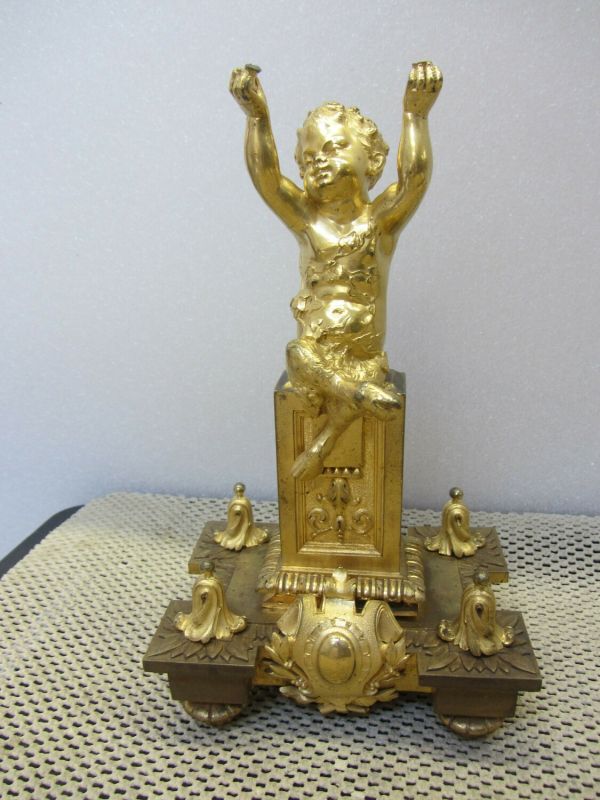 Socle ouvragé avec patine et fleurons à l'envers. Sur la face cartouche avec lauriers. Dessus : petit socle décoré de rinceaux. Sur le socle est assis un petit faune rigolard qui tenait quelque chose qui à été coupé depuis.