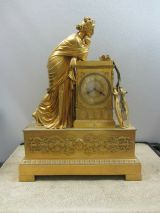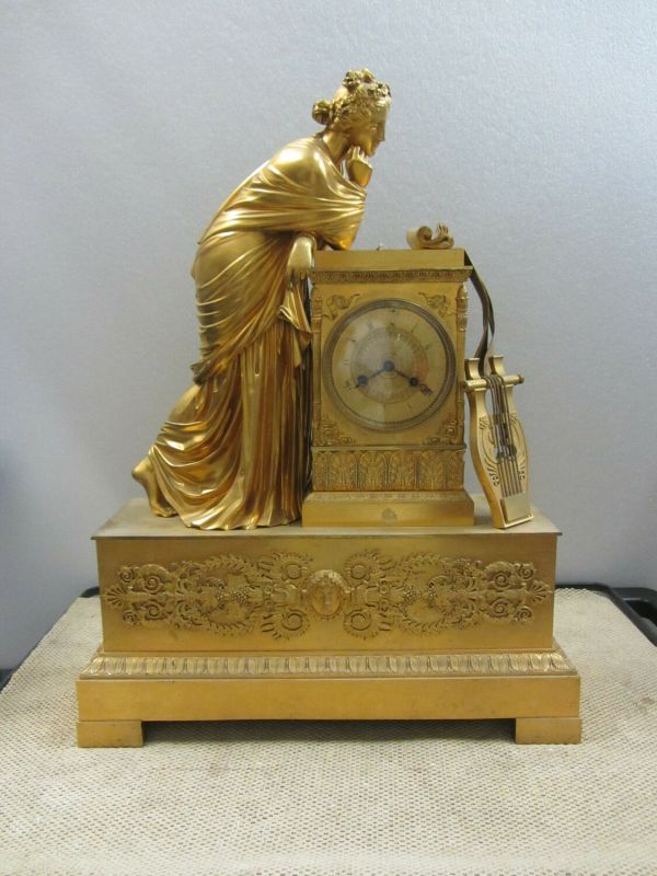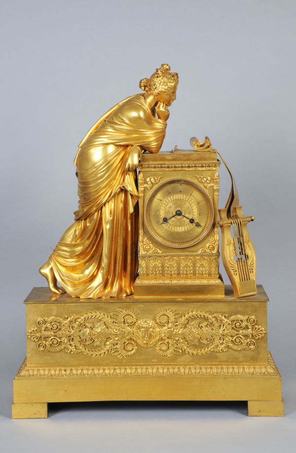 Haut socle et contre socle avec rais-de-cœur. Sur la face tête, avec de part et d'autre, enchevêtrement de feuillages, palmettes, dont de la vigne. Borne décentrée vers la droite comportant le cadran, avec décor de palmettes à la base et bâtons antiques aux 4 angles. Sur la droite, grande lyre. Sur la gauche, Erato ou une poétesse en robe longue, l'air mélancolique, accoudée sur la borne et regardant des parchemins déroulés.