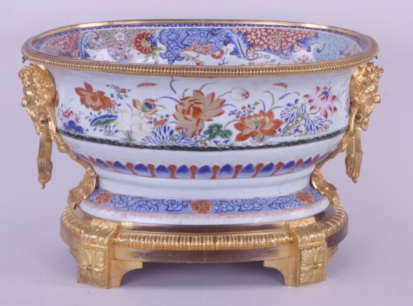 Coupe oblongue à fond blanc, motifs de fleurs oranges, blanches et bleues, sur la panse, le fond et la bordure intérieure; montée en bronze doré de style XVIIème siècle : piedds carré à culot d'acanthe surmontés d'une console d'acanthe, socle à godrons base de la poignée en masque de satyre d'où part la poignée, carrelage du col à godrons.