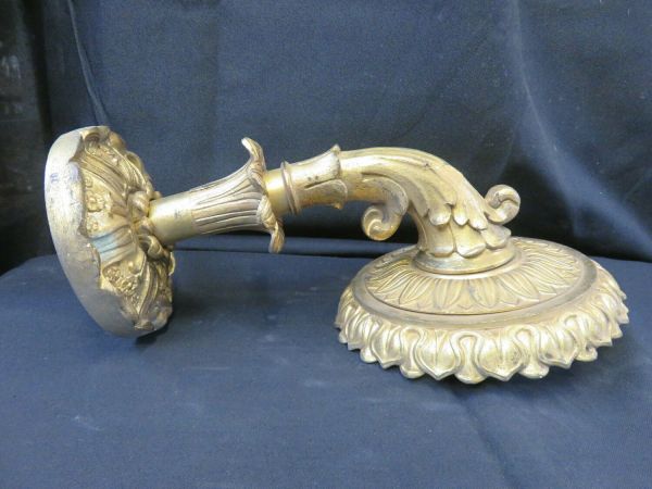 - Platine à rosace ornée de culots, d'où part un bras horizontal en fleuron avec culot en cornet portant le plateau ciselé de feuilles d'eau de rais de coeur.