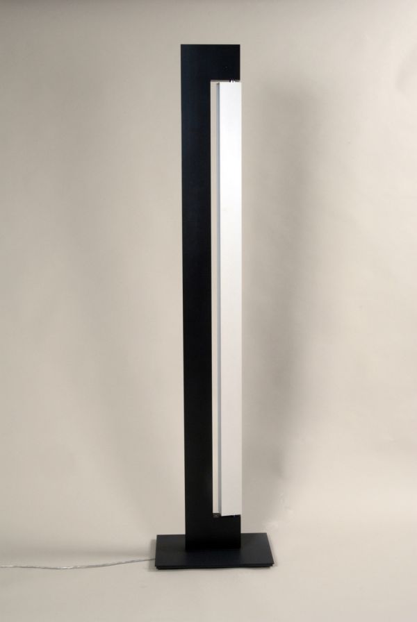 Lampadaire rectangulaire en 2 parties reposant sur un socle en métal anthracite, rectangulaire également. La lumière halogène est placée sur le haut de la structure en métal anthracite. Celle-ci est évidée partiellement d'un côté et maintient l'autre partie en plexiglas gris clair qui peut pivoter sur l'axe vertical et dissimule un éclairage fluorescent. Le variateur à pied est rond et transparent.