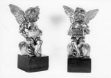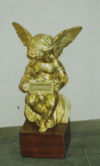 Sur socle acajou, un ange à ailes déployées assis sur un coussin à franges, la tête tournée sur le côté tient sur ses genoux un écriteau gravé "Rossini"