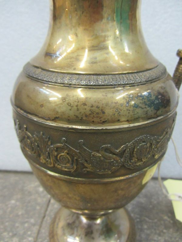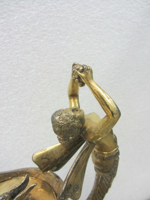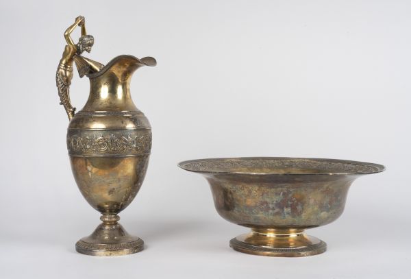 Les poinçons d'orfèvre sont illisibles sur l’aiguière et son bassin. Ce modèle est néanmoins connu par de nombreuses variantes. La plus ancienne semble due à l’orfèvre Marc-Augustin Lebrun, et présente une riche frise en relief ceinturant la panse, à motifs de lions ailés terminés en rinceaux et de lyres. Le musée du Louvre en conserve une, en vermeil, avec son bassin assorti (Paris, vers 1810-11/1819, inv. OA 9692/1, anc. coll. Puiforcat). Un ensemble semblable, également en vermeil, est exposé au musée Condé de Chantilly (legs duc d’Aumale, inv. OA 1573). Deux autres ensembles du même type sont passés récemment en vente publique (Paris, vente P. Bergé et ass., 14 déc. 2012, lot 76 ; et Paris, vente Fraysse, coll. Dr J. Vincent, lot 57). Tous sont l’œuvre de Lebrun.