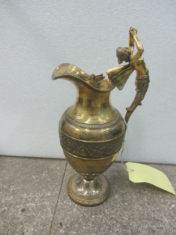 Une autre variante, plus sobrement ornée et en argent, est due à Nicolas-Xavier Goulain (Paris, v. 1819-1829 ; musée du Louvre, inv. OA 10983). La panse est gravée de festons de roses. On connait une autre version de ce dernier modèle, en argent, la panse gravée de rinceaux et le culot de feuilles d’eau, et ayant conservé son couvercle au bouton en forme de cygne (non signée, Lyon, vente Ivoire, 29 avril 2014, lot 390). Goulain a aussi livré une version plus riche de cette aiguière, en vermeil, et dont la frise et le culot sont aussi gravés plutôt qu’en relief (Paris, vente Fraysse, 27 nov. 2013, lot 236).