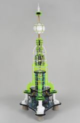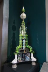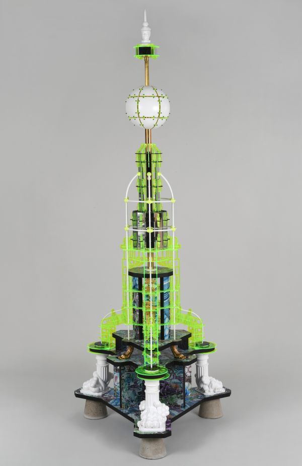 Le lampadaire d'origine est désormais dépourvu de toute logique d’usage, aussi les fûts des luminaires ont servi de structures porteuses pour développer ce projet représentatif du travail de cet artiste. Il exposait dernièrement dans les mêmes matériaux, des compositions florales et une maquette de la flèche de Notre Dame de Paris reconstituée en plexi rose d’après les dessins de Eugène Viollet-le-Duc. Formé au design industriel on reste charmé par l’aspect maîtrisé de « maquette artistique » qui prévaut dans son travail et qui nous entraîne à mi-chemin entre l’univers de la bande dessinée et celui du cabinet de curiosité.