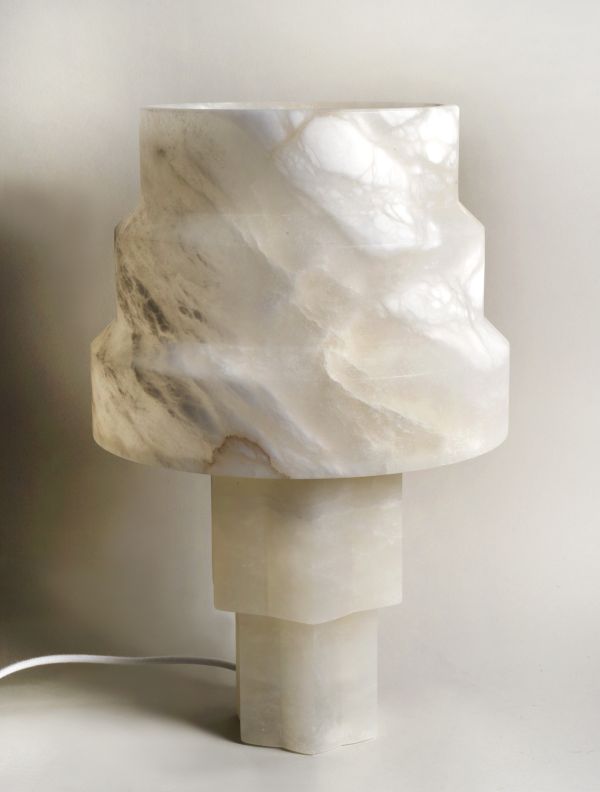 Lampe à poser en albâtre translucide. Le pied est formé de deux pièces polylobées superposées, la plus grande au-dessus de la plus petite. Un abat-jour d’albâtre veiné de brun s’évasant en escalier de haut en bas à 3 niveaux surplombe ces 2 parties.