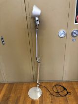 Lampe en aluminium reposant sur une base circulaire avec un bras articulé.