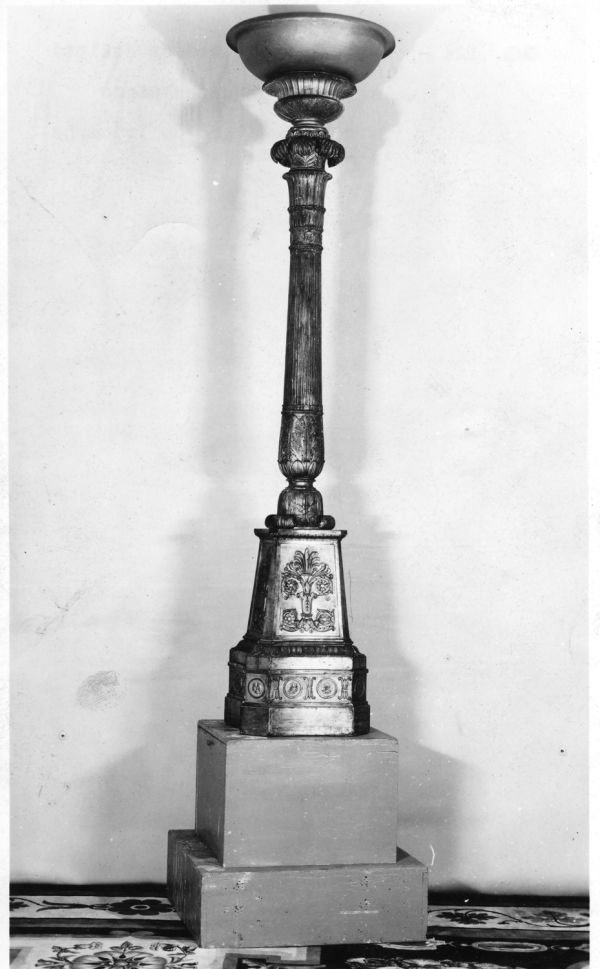 D'un ensemble de quatre torchères décrites en 1894 dans les magasins du Mobilier national (Arch. Mob., nat., Inventaire de 1894 et entrées, volume n° 1, f° 21, n° 124).
