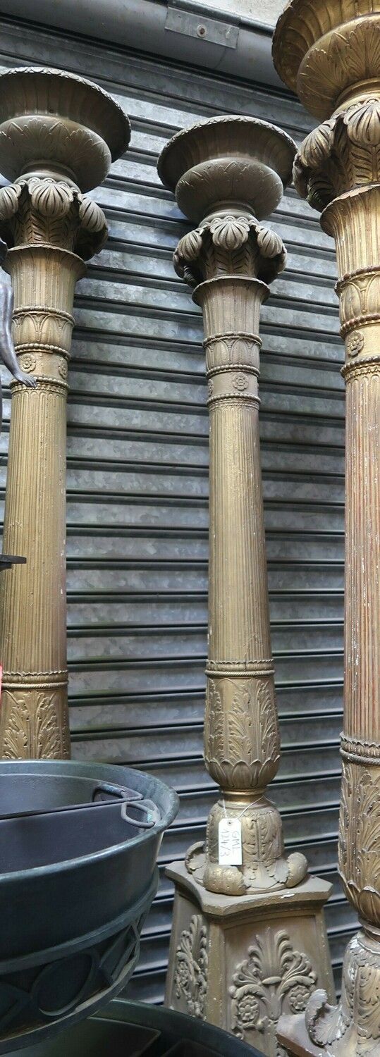 Torchère en bois sculpté et doré, socle carré aux quatre face excusées, ornés de culots et de rosaces, base carrée tronconique sculpté de feuilles d'eau, fleurets et culots à feuilles d'acanthe, colonne cannelée sculptée à la base de feuilles d'acanthes, feuilles d'eau et surmontée de feuilles de palmier.
