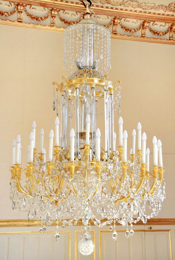 Une demi-sphère en cristal taillé supportant à la base un culot ciselé d'où pend un gland cristal taillé terminé par une pomme de pin tenant une boule cristal à pointes de diamant. Cette coupe dans une ceinture bronze moulurée fond creux à palmettes ajourées à la base masquant le départ de dix branches en C se divisant chacune dans feuille engainante en trois branches, la centrale formant une grande volute laquelle est surmontée d'un culot portant un cornet en forme de lys formant bobèche avec binet tourné uni, équipéde de fausses bougies les deux symétriques en arc terminées par même culot à bobèche et binet équipé. Au dessus de cette ceinture dix cygnes aux ailes déployées et tenant dans leur bec des guirlandes.