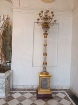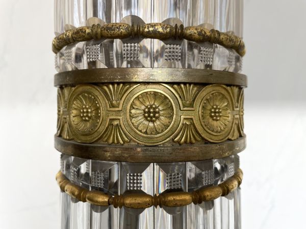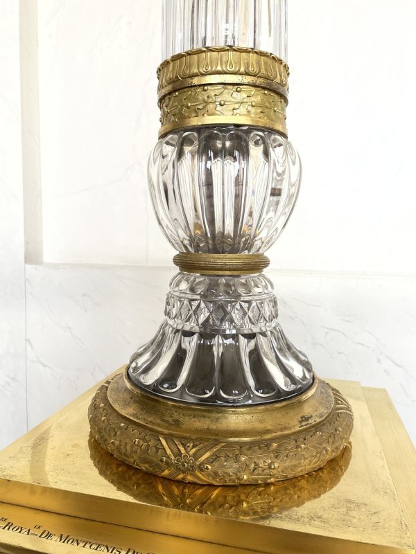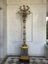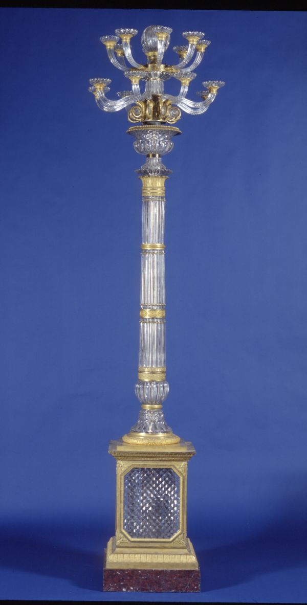 16 lumières en 2 rangs. Stèle carrée bronze à plinthe marbre griotte rouge, base moulurée, le centre ciselé feuilles d'eau arêtes acanthes. Corniche moulurée, ciselée de rais de coeur et feuilles d'eau ; les 4 côtés en panneau cristal taillé en pointe de diamant dans moulure rectangulaire à pans coupés, ciselée de feuilles d'eau les 4 angles à culot sur rinceaux à rosaces supportant une colonne faite de 4 rangées de fûts cristal à godrons la base renflée sur un culot renversé en cristal; le tout séparé de bagues et frise bronze doré ciselé, comme la couronne de base en feuilles de chêne enrubannées. Chapiteau feuilles d'eau à rouleau portant vase comme vasque en cristal à godrons, le col en pointe de diamant et galerie bronze. Trois supports en cristal en S à volute base et sommet en bronze. 1 rang supérieur de S support en cors en arcs, même décor et sphère au sommet à côtés en godrons, chaque branche terminée par un bassin en cavet ciselé portant une coupelle cristal avec bobèche portant bougies de cire.