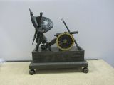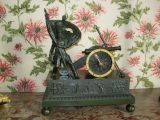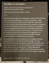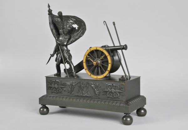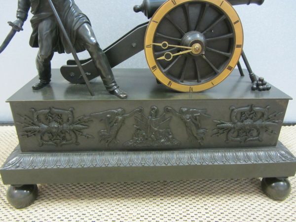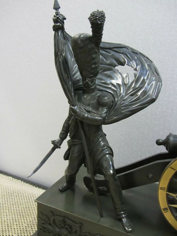 Socle rectangulaire uni à quatre patins, boule et moulure, feuilles d'eau ciselées.Un vieux grognard, coiffé du bonnet d’ourson de la Garde impériale, sabre dans la main droite, tient bravement par la hampe un drapeau percé par la mitraille ennemie, en écho au cri héroïque prêté au général Cambronne à la bataille de Waterloo : « la Garde meurt mais ne se rend pas. » A côté d’un tas de boulets, écouvillon et tirebourre s’appuient sur un canon, dont le cerclage de la roue est utilisé en guise de cadran numéroté pour les heures. Le socle présente deux foudres et un trophée d’armes couronné par la Victoire et la Renommée.