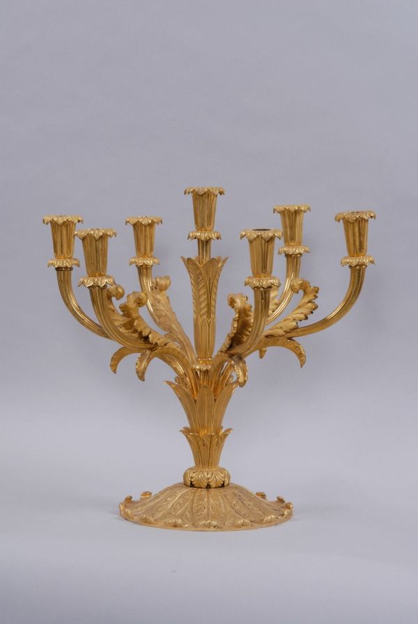 Bronze doré. Base en doucine, grande rosace ornée de feuilles, surmontée d'un culot à 2 étages d'où partent 6 branches en S se terminant en bouton de fleur formant binet ; bobèche unie.