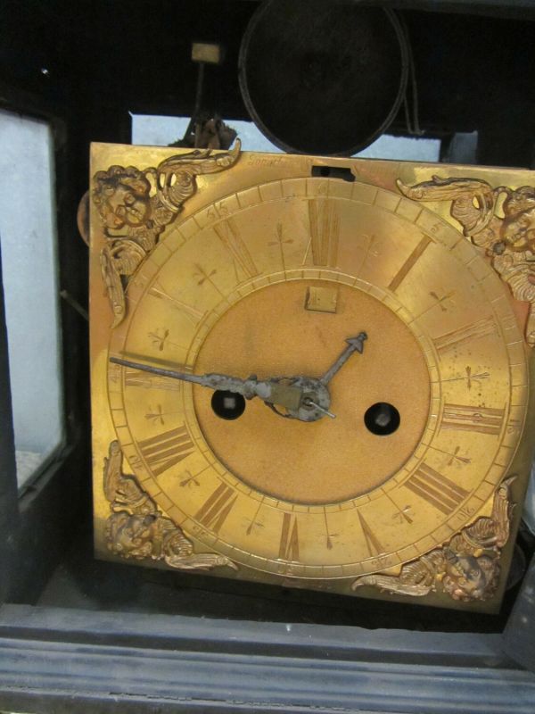 Forme carrée, poignée cuivre. Cadran cuivre gravé, ciselé et doré. Cage rectangulaire en bois noir, vitrée sur 4 faces. Dessus en coupole rectangulaire. Jonthan gravé sur la face du cadran. Lorunds - In Pall - Mal London. Mouvement ancien à transmission cordes.
