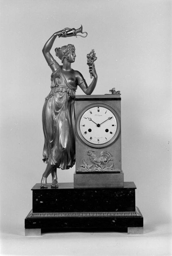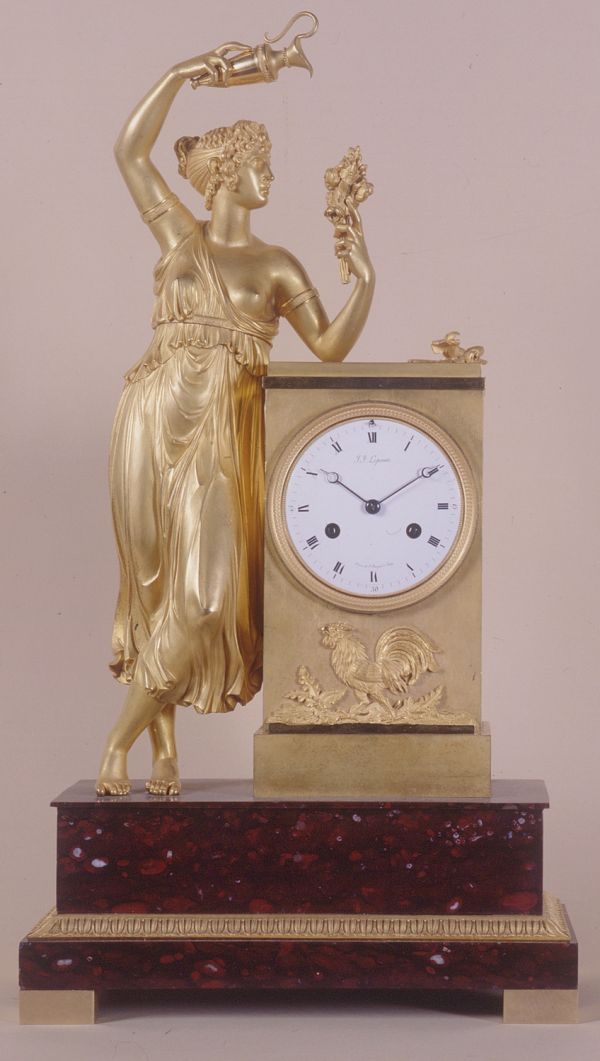 Socle rectangulaire en marbre griotte. Socle à moulure de feuilles d'eau ciselées. Une femme drapée, debout "Hébé" appuyée d'une borne rectangulaire, bas-relief coq ciselé. Cadran émail mouvement "LEPAUTE". Entre 1805 et 1810.