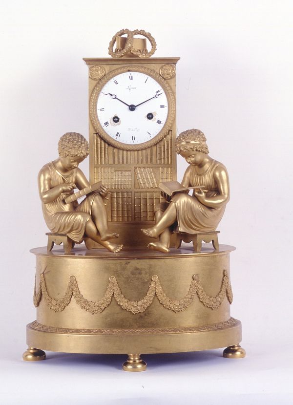 Socle circulaire orné d'une guirlande, surmonté d'une bibliothèque avec livres rangés sur rayonnages avec deux enfants, un qui écrit, l'autre qui lit, surmontée de deux couronnes. Mouvement à sonnerie. Vers 1821.