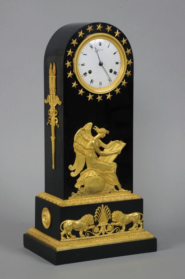 Forme borne à appliques bronze sur le socle : 2 lions et palmettes. 2 flambeaux sur les côtés. Cadre du cadran orné d'étoiles, figure d'étude sur la face, mouvement à sonnerie. Vers 1804.