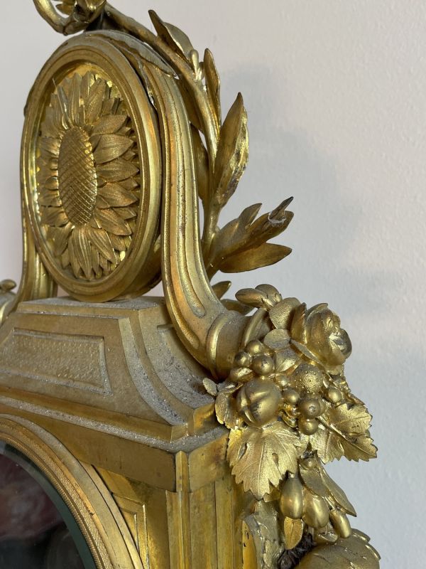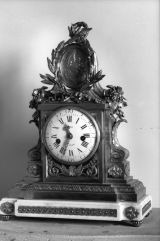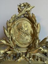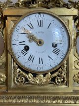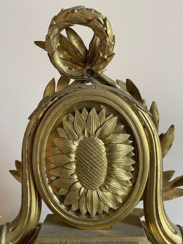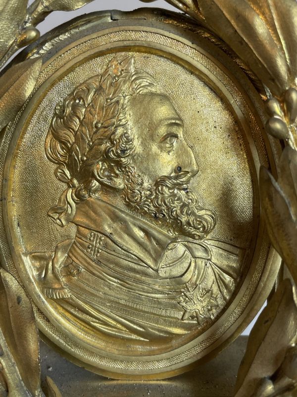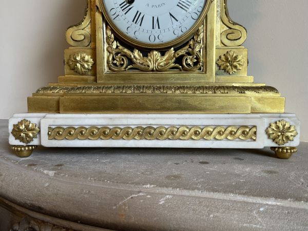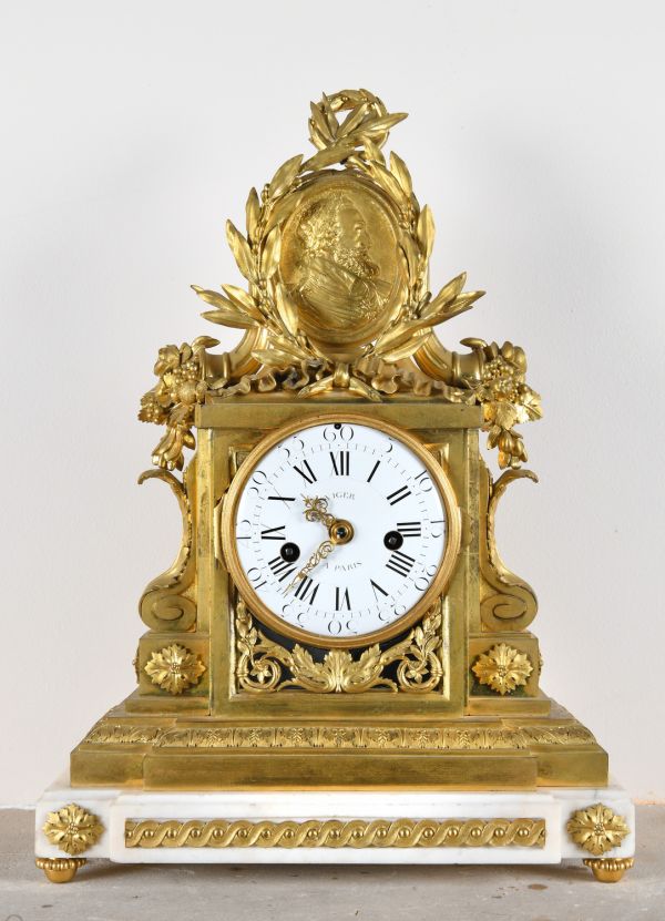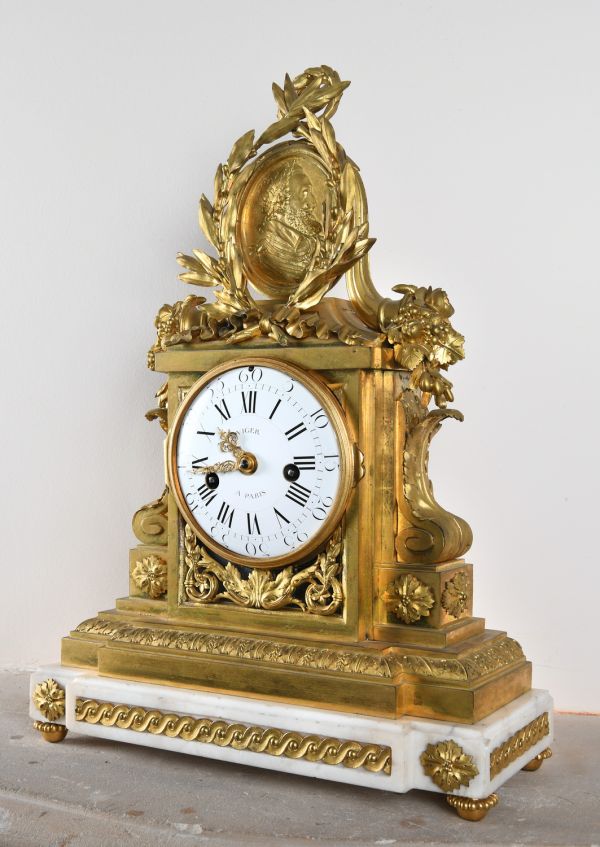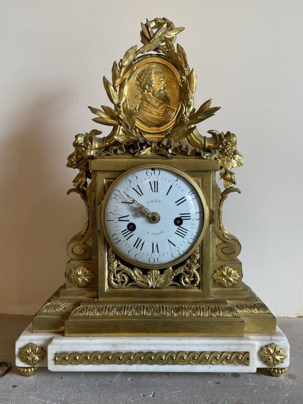 Socle en marbre blanc mouluré supporté par quatre patins tournés et ornés d'entrelacs dans les fonds creux. Ce socle supporte une borne tout en bronze doré dont la base moulurée présente un décor de feuilles d'acanthe. La partie médiane, de forme rectangulaire, est flanquée de deux consoles en forme de feuille reposants sur des bases carrées ornées de rosaces ciselées. Sous la lunette ouvrante (verre bombé) prend place des rinceaux ciselés. Le cadran en émail est signé "Viger à Paris". Au sommet, un important médaillon ovale (médaille d’Henri IV) flanqué de deux cornes d'abondance et entouré d'une couronne de lauriers nouée d’un ruban achève le décor.