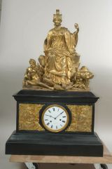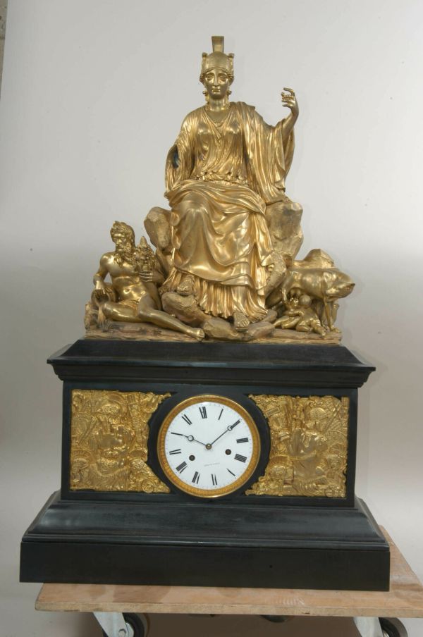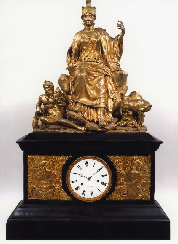 Par une soumission approuvée le 11 septembre 1812, cette fourniture de bronzes comprenait une pendule représentant la déesse Rome flanquée d’une allégorie du Tibre d’un côté, et de l’autre, de la Louve accompagnée de Romulus et Rémus. L’allégorie, dont un des bras est aujourd’hui lacunaire, portait initialement une lance d’un bras et un palladium de l’autre. Les trophées en bas-relief décorant le socle sont inspirés de ceux de la colonne trajane. L’iconographie de cette pendule était ainsi spécialement conçue pour évoquer le titre de « roi de Rome » que l’héritier de l’empereur reçut à sa naissance.