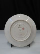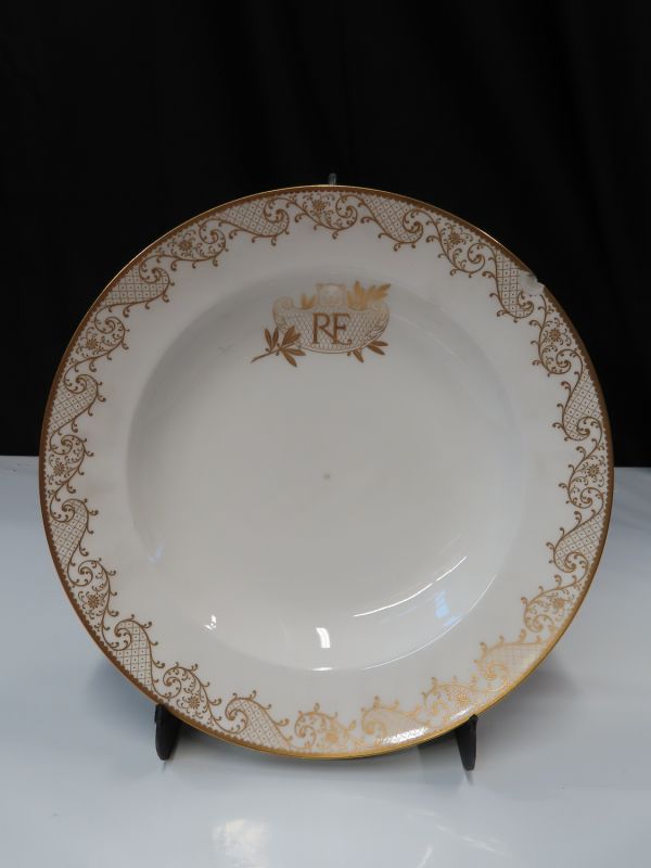 Sur le marli : décor de postes et résilles et marguerites en tracés or, et bord à filets festonnés or. A la partie médiane : écusson avec tête de lion, et imbrications en écailles sur branches de laurier et monogramme R.F. tout or.