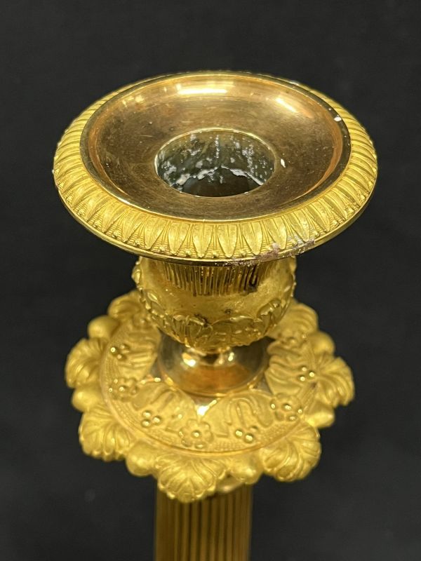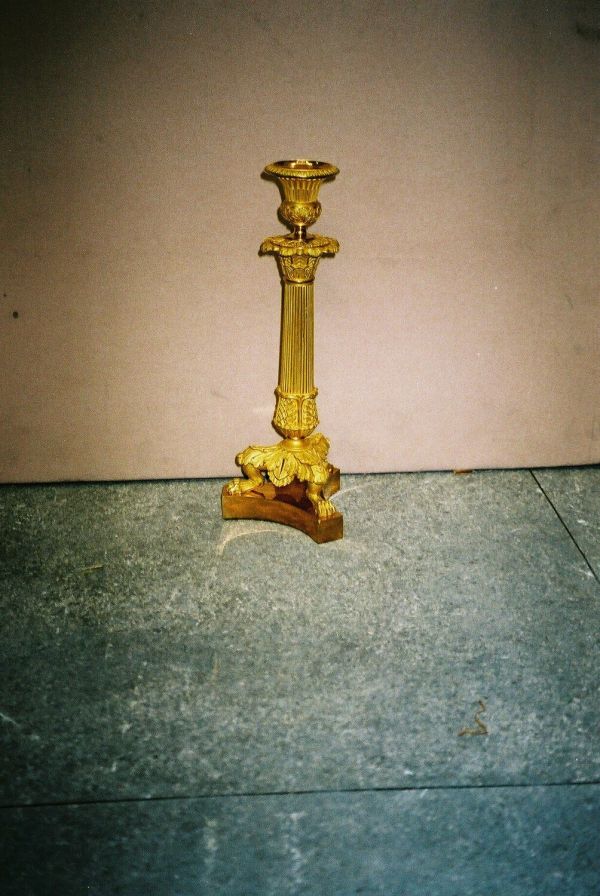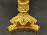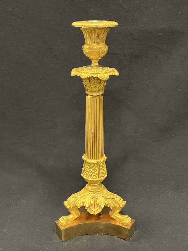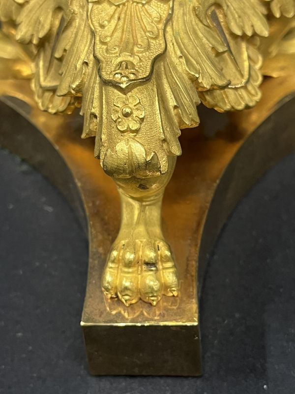 Socle triangulaire concave uni portant piètement de 3 jarrets monopodes, repliés à griffes et recouverts d'un culot d'acanthes à crossette sur le jarret et en feston entre chacun. Fût tourné à petites baguettes rondes dans 4 feuilles d'eau ciselées de rinceaux, sommet évasé en feuilles nervées en panache sous binet en vase à piédouche uni, base renflée ciselée sous évasement en petites feuilles d'eau ; coupelle mobile à bord mouluré et ciselé petites feuilles.
