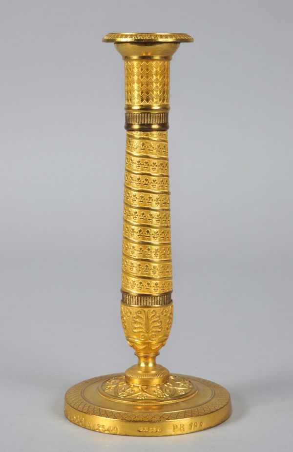 Paire de flambeaux livrée au Garde-meuble par Louis-Isidore Choiselat, fabricant de bronzes à Paris, le 12 août 1817 pour le service de la loge du roi au Théâtre français. Rentrée au Garde-meuble le 11 octobre 1830, elle est utilisée au palais de l’Elysée puis répertoriée en 1862 à l’hôtel de la Vénerie et en 1867 dans le cabinet de toilette des Grands appartements du Premier Veneur. Elle est renvoyée au Garde-meuble en 1868 et déposée pour un an, en 1869, au haras de Meudon. En juillet 1877 elle est installée dans le salon de l’appartement de l’architecte au Palais-Royal.